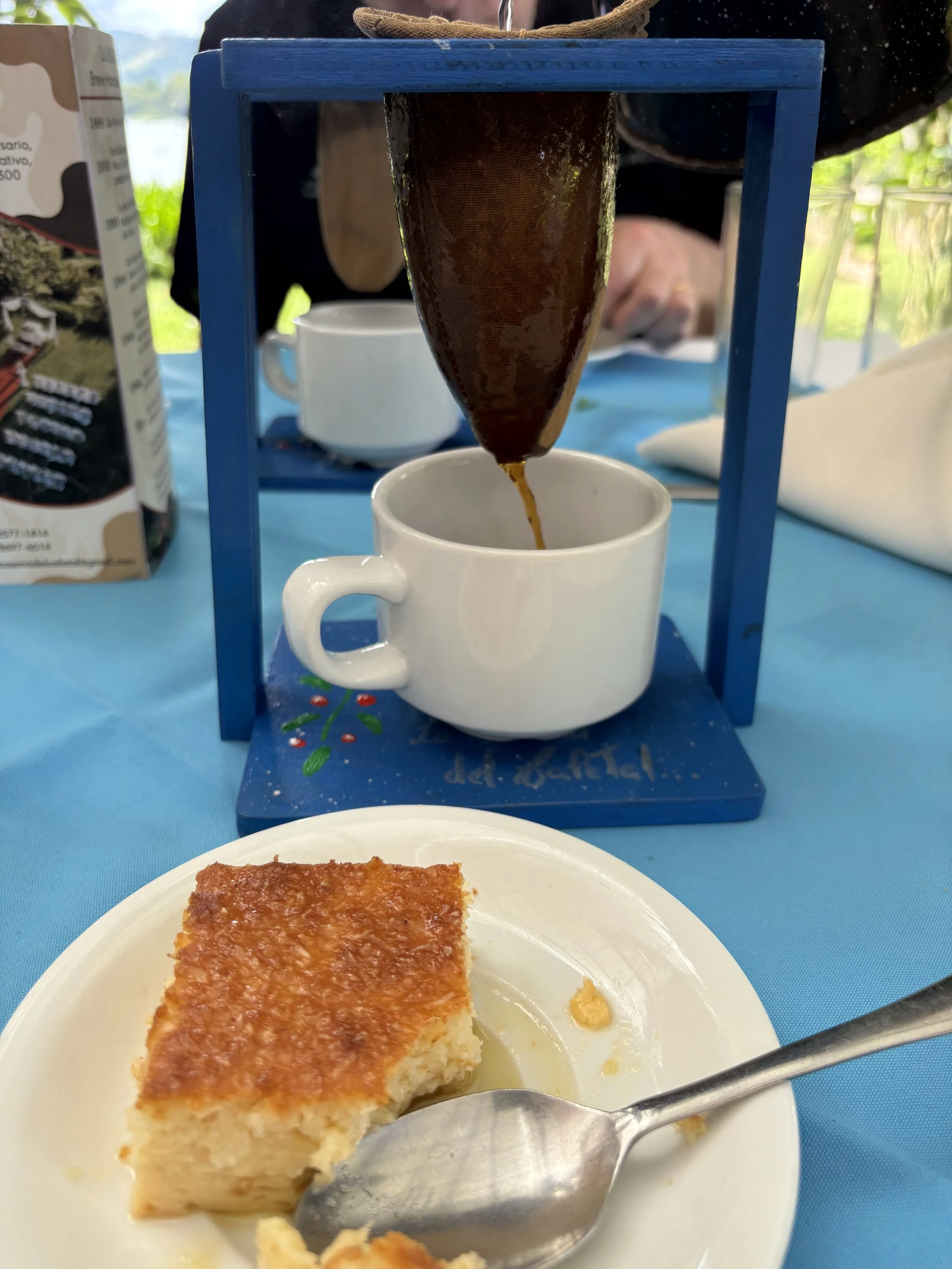 How nice to wake up to bird song…..The hotel Grano de Oro is a charming haven in the city of San Jose…tiny corridors…that lead to upper levels and half levels….art, artifacts antiques and orchids at every junction…my room is on a tiny courtyard that is more jungle than garden….beautiful central courtyard that house the bar and dining room…a lovely spot to enjoy breakfast…off to tour Orosi valley and Lankester gardens today….fellow picks me up …as we drive out of town he informs me that he will leave me at Iglesia de San Jose Orosi …the oldest Catholic Church in Costa Rica…..where I will join another group ….2 fellows from New Zealand ( one of which was completely blind)…an attractive young IT guy from Argentina….we all touch the stone where a saint first appeared and jostle through the throng of people on a Sunday morning…..a short visit to the ruins of Ujarras then dip down into the Orosi valley….lush jungle on both sides of the tiny winding road….many bridges one lane only…no one seemed to be in a hurry thankfully….small villages come and go…. a large dam has created a huge lagoon….massive clumps of water lilies….enchanting old wooden houses that look like a jigsaw puzzles…..we turn down a dirt lane that is bordered by coffee trees…seemingly out of nowhere we pull up to a quiet little restaurant overlooking the lagoon…expansive veranda where we enjoy lunch….one unusual item is how the coffee was served….cafe chorrealo …an open sided box holds a cup and above it is a piece of linen with a metal hoop filled with coffee….pour hot water…wait then pour more water….such a fun way to have a coffee after lunch.